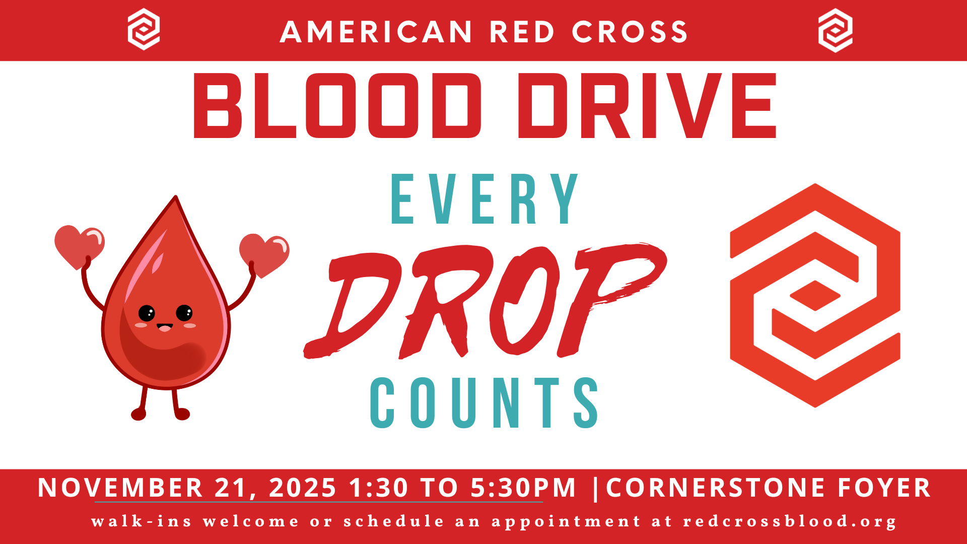 01.23.26 | 1:30 pm American Red Cross Blood Drive Cornerstone Church American Red Cross Blood Drive Friday, January 23rd, from 1:30 pm to 5:30 pm Cornerstone Church Gym Appointments encouraged. Please click the link below to get started! Please share to view details